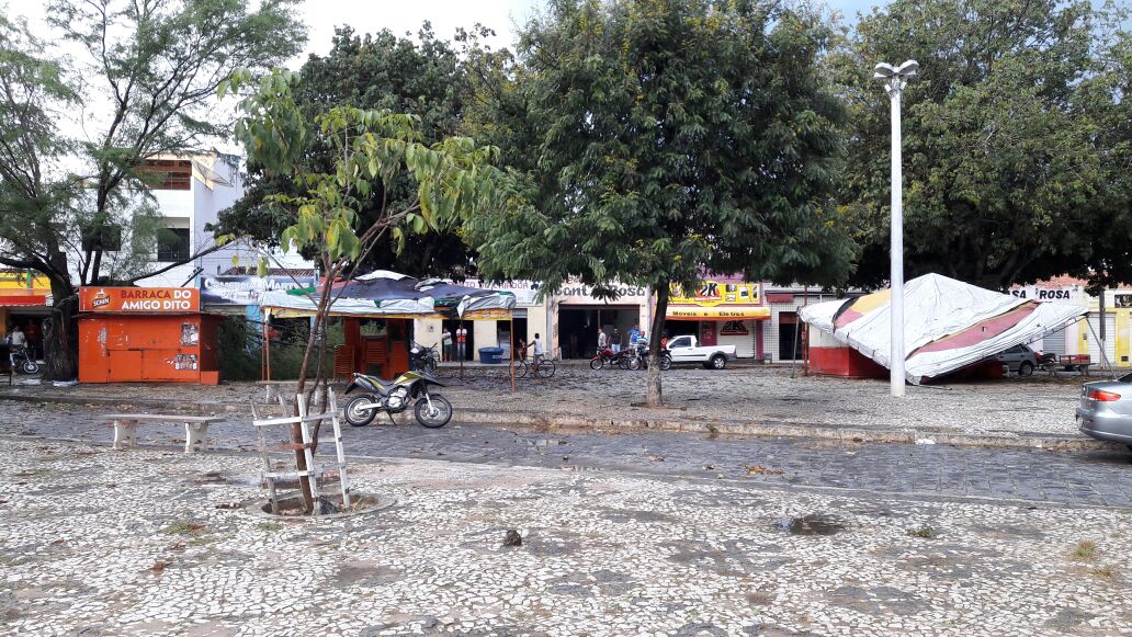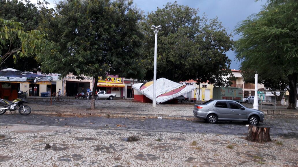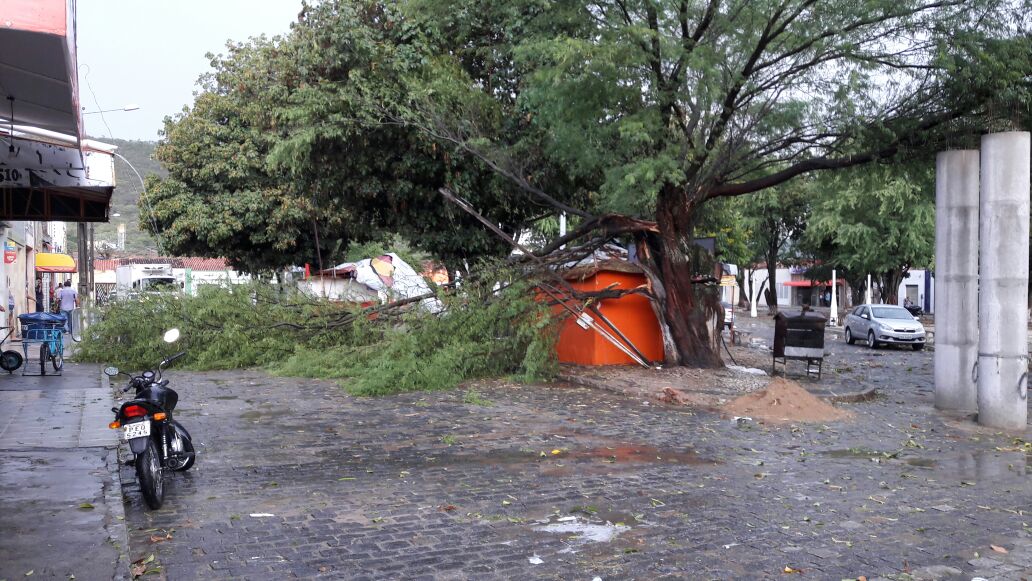 Chuva acompanhada de vento provocou a queda de uma árvore sobre uma barraca na tarde desta quinta-feira (4) na Praça Presidente Kennedy, no centro da cidade de Antônio Gonçalves, um toldo também caiu na mesma praça com a força do vento.