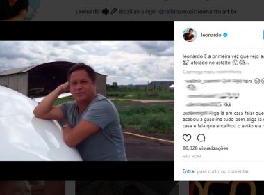 O jatinho do cantor sertanejo Leonardo ficou atolado na pista do aeroporto de Barreiras, oeste baiano, neste sábado (9). O incidente ocorreu devido às chuvas que caíram na região. Em dois vídeos postados nas redes sociais, o vocalista chegou a brincar com o fato. “Choveu até atolar o avião. Ali, mostra lá! Nós vamos furar o pneu do avião com essa pá”, disse em vídeo publicado. “É a primeira vez que vejo avião atolado no asfalto. Acontece de tudo, né?”, falou em outro vídeo. Leonardo se apresentou na noite de sexta-feira (8) no Parque de Exposições da cidade, dentro da turnê Cabaré.