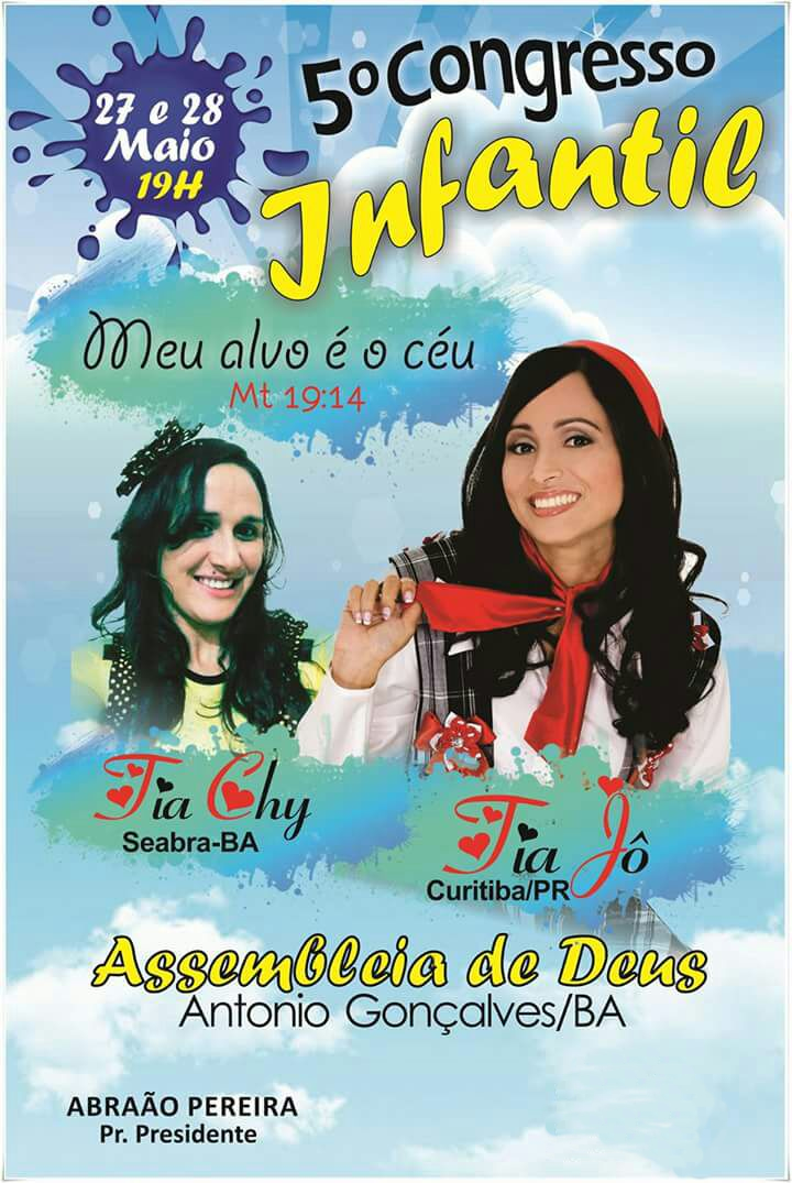 Acontece no próximo final de semana, 27 e 28 de maio o 5º Congresso Infantil da Igreja Assembleia de Deus na cidade de Antonio Gonçalves-BA.