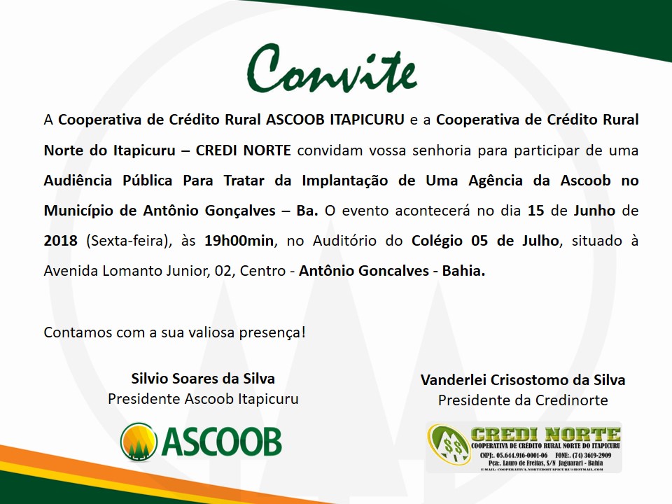 Destaque Cooperativa de crédito rural Ascoob Itapicuru convida população para audiência pública em Antônio Gonçalves 9 Junho, 2018 AG Notícias