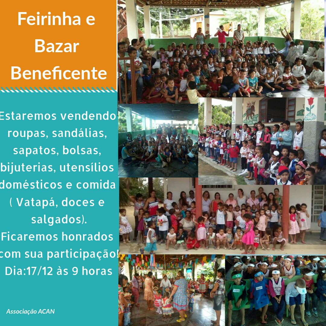 A creche lar da infância vai promover mais uma filhinha e bazar beneficente que acontecerá no dia 17 de dezembro às 9 horas da manhã, no bazar serão vendidos roupas sandálias sapatos bolsas bijuterias utensílios domésticos e comida (vatapá doces e salgados).