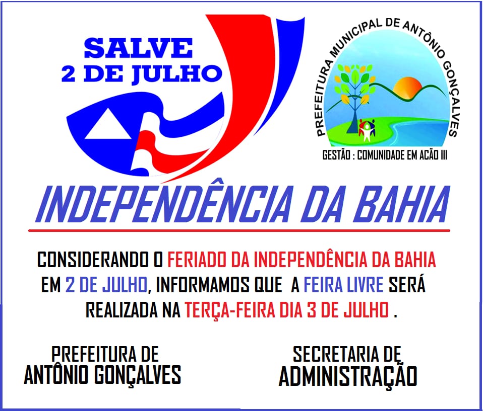 DestaqueLocal Devido ao feriado de 2 de julho feira livre de Antônio Gonçalves será na terça-feira 30 Junho, 2018 AG Notícias Através de comunicado a Prefeitura Municipal de Antônio Gonçalves informa que devido ao feriado de 2 de julho a feira livre vai acontecer na terça-feira 3.