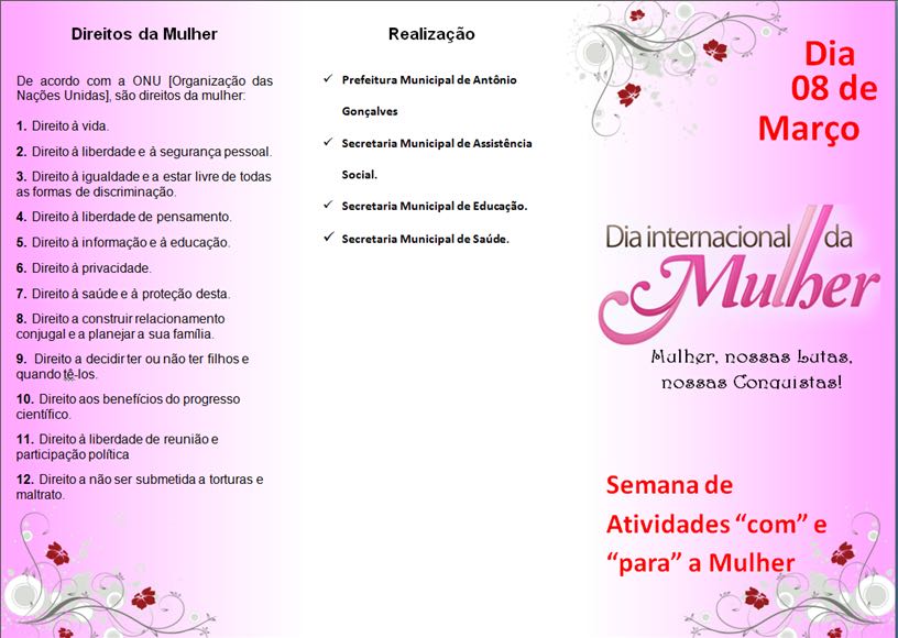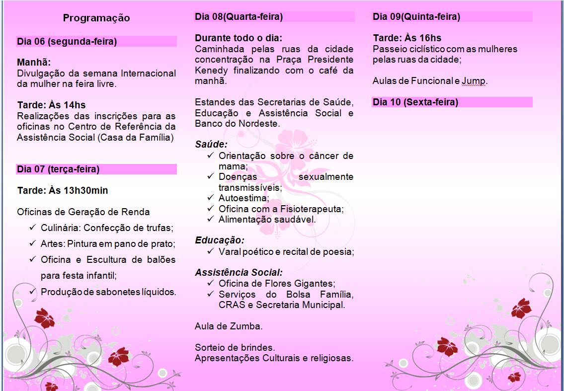 No decorrer da semana,estaremos realizando atividades “com ” e “para” a mulher,contando com a participação das igrejas e das secretarias de saúde e educação.