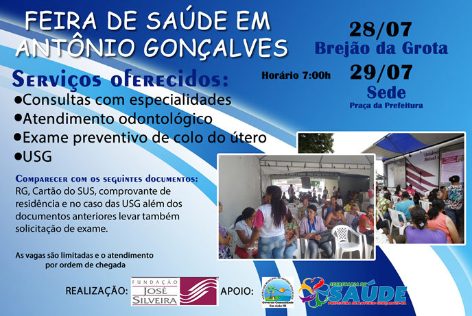 A fundação José Silveira em parceria com a Prefeitura Municipal de Antônio Gonçalves através da Secretaria Municipal de Saúde realizará a Feira de Saúde, que acontece nos dias 28/07 no Povoado de Brejão da Grota e dia 29/07 na Sede do Município, serão disponibilizados os seguintes serviços: Consultas médicas em algumas especialidades, atendimento odontológico, exame preventivo de colo do útero e USG. Os atendimentos serão iniciados a partir das 7:00h, para a realização dos mesmos os usuários devem comparecer munidos dos seguintes documentos: RG, Cartão do SUS, comprovante de residência e no caso das USG além dos documentos anteriores levar também solicitação de USG. Informamos que as vagas são limitadas e os atendimentos serão realizados por ordem de chegada.