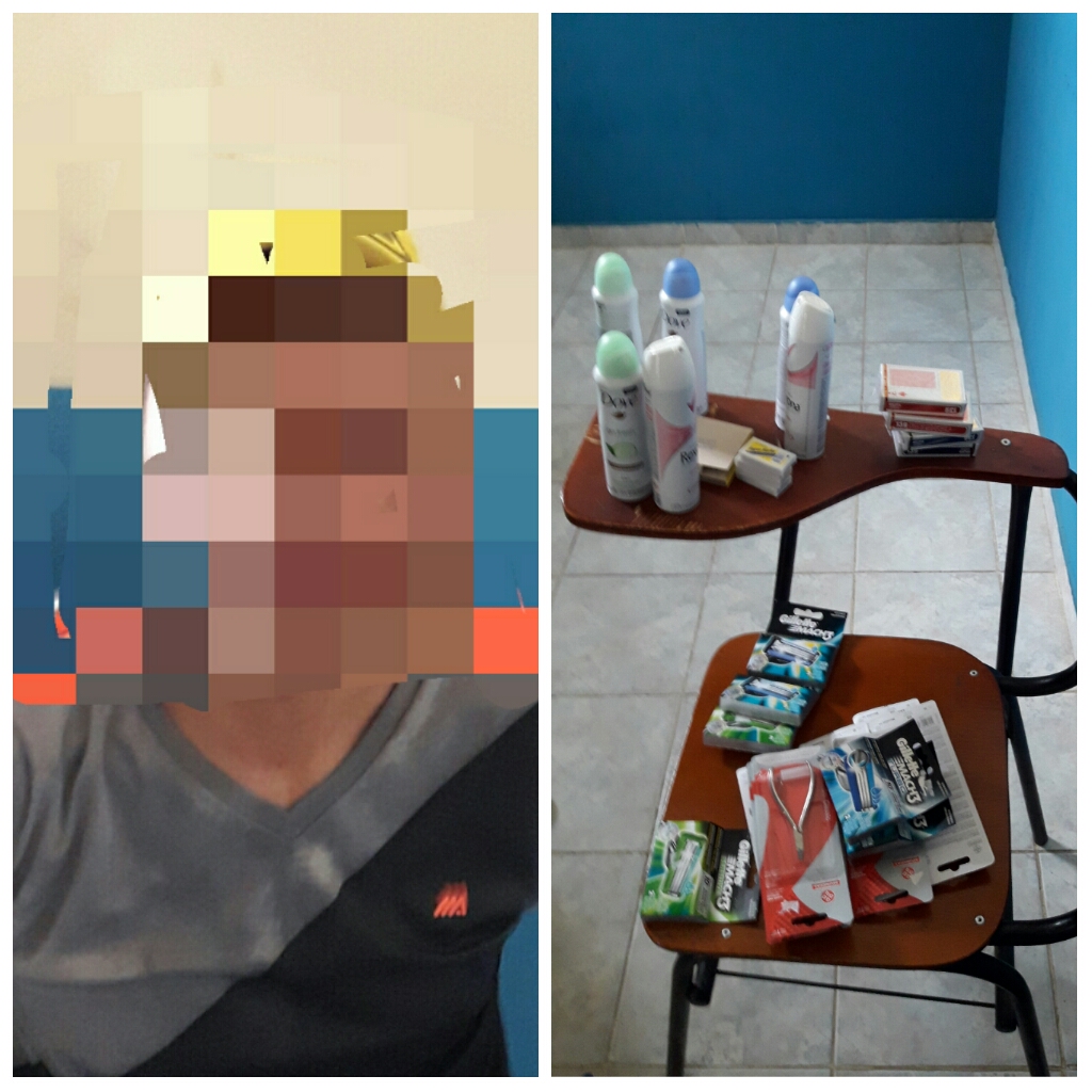 Por volta das 12h15 do dia 31/08/201 a CENOP do 4º PEL da 54ªCIPM em Antônio Gonçalves foi informada por telefone que um indivíduo havia praticado furto em um estabelecimento comercial na Praça Presidente Kennedy, Centro de Antônio Gonçalves e que estaria evadindo para o terminal rodoviário. De imediato a guarnição deslocou até a rodoviária, onde encontrou um indivíduo, que ao ser indagado disse ser natural de Juazeiro, ao passar pela busca pessoal em sua posse foi encontrado o seguinte material: 06 frascos de desodorante aerosol, 08 alicates de unha, 16 caixas de lâminas de barbear e 04 caixas de baralho. Após averiguar as imagens do estabelecimento foi confirmado o furto e o acusado bem como o material foram apresentados na Delegacia de Antônio Gonçalves para a tomada das medidas cabíveis.