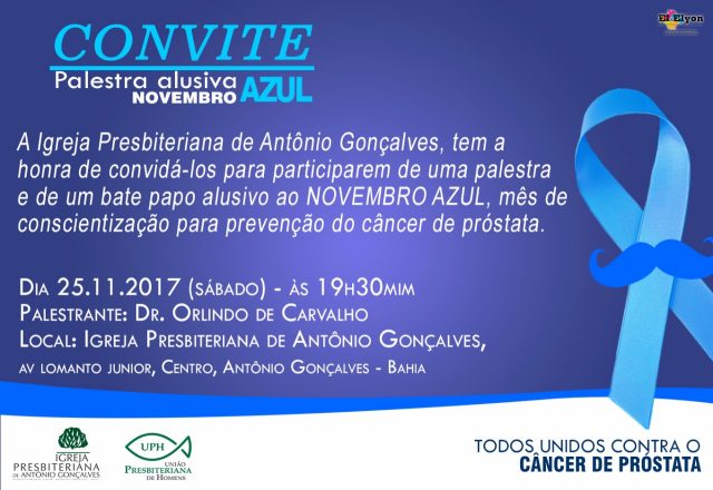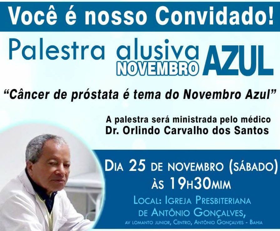 A Igreja Presbiteriana de Antônio Gonçalves vai promover no dia 25 de novembro, às 19:30h, palestra alusiva Novembro Azul “câncer de próstata é tema do Novembro Azul” a palestra será ministrada pelo médico Doutor Orlindo Carvalho dos Santos.