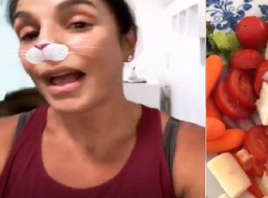 Após o nascimento das gêmeas Helena e Maria, Ivete Sangalo está focada em recuperar seu corpo. A mamãe, que já mostrou que está firme na rotina de academia (veja aqui), compartilhou na tarde desta quarta-feira (4) uma foto de seu almoço light com os seus seguidores. No prato, a cantora caprichou nos legumes, representados por porções de alface, tomate e cenoura. “O que a coelhoca come? Olha que bonito! Vamos lá, foco!”, declarou Ivete no Instagram. Depois de comer, a artista ainda aproveitou para queimar calorias na academia de sua casa. “Olha eu aqui de novo, essa é a única hora que eu consigo fazer os meus stories”, comentou Ivete na rede social, fazendo alusão ao tempo longe das gêmeas.