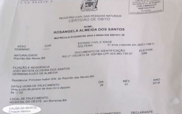 A certidão de óbito aponta um quadro de choque séptico como causa do falecimento. A situação está sob investigação da Polícia Civil de Riachão das Neves.