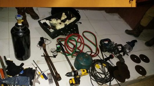 Segundo a PM, foram encontrados maçarico, dinamite, furadeira, pé de cabra, entre outros materiais que seriam usados para explosão do cofre. A PM ainda informou que os bandidos foram encontrados quando tentavam se desfazer do material na estrada. A polícia não soube detalhar quantos suspeitos participaram da ação, mas realiza buscas por outros envolvidos com ajuda da dupla que foi presa. Como não houve danos materiais, a agência bancária funciona normalmente nesta quinta-feira.