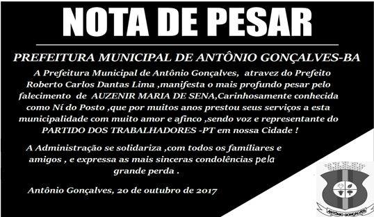 Destaque Prefeitura divulga Nota de Pesar pelo falecimento da Senhora Auzenir (NI) 20 Outubro, 2017 AG Notícias PUBLICIDADE PUBLICIDADE