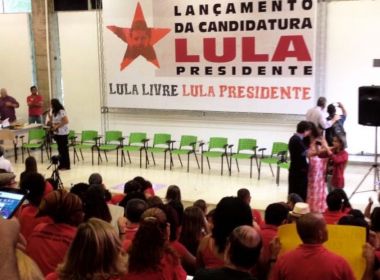 Conforme previsto (veja aqui), o Partido dos Trabalhadores oficializou neste domingo (27) o nome do ex-presidente Luiz Inácio Lula da Silva como o candidato do partido à presidência da República, em atos por todo o Brasil. Mesmo com a paralisação dos caminhoneiros, que prejudica a mobilidade em diferentes pontos do estado por conta da falta de abastecimento de combustíveis, o PT realizou, somente na Bahia, o evento simbólico em pelo menos 30 municípios diferentes. Em Salvador, cerca de 300 pessoas foram até o auditório da Faculdade de Arquitetura da Universidade Federal da Bahia (Ufba) para apoiar a apresentação da candidatura do ex-presidente. O ato previsto para às 9h teve início às 10h com a presença de movimentos sociais, simpatizantes e integrantes do PCdoB e da União Nacional dos Estudantes (UNE). O próximo passo do PT agora será registrar a candidatura de Lula até o dia 15 de agosto, dentro do que diz a lei eleitoral. Fonte: BN